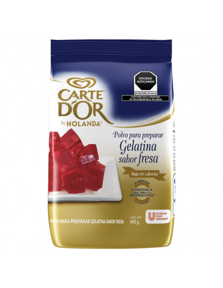 Polvo cristalino, brillante de color rosa-rojizo de aroma a fresa, dulce. Una vez preparado es un gel de color rojo brillante translúcido con aroma a fresa, dulce y sabor ácido, dulce a fresa; de consistencia húmeda, suave, firme y gelatinosa.